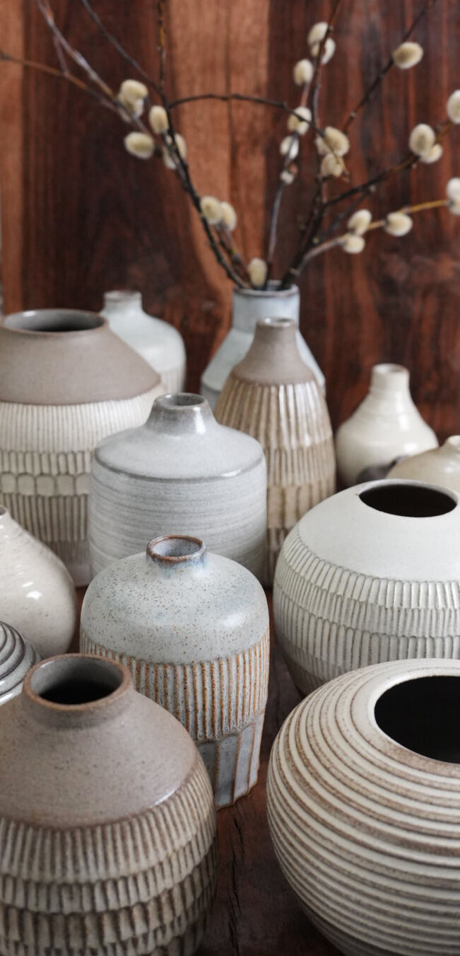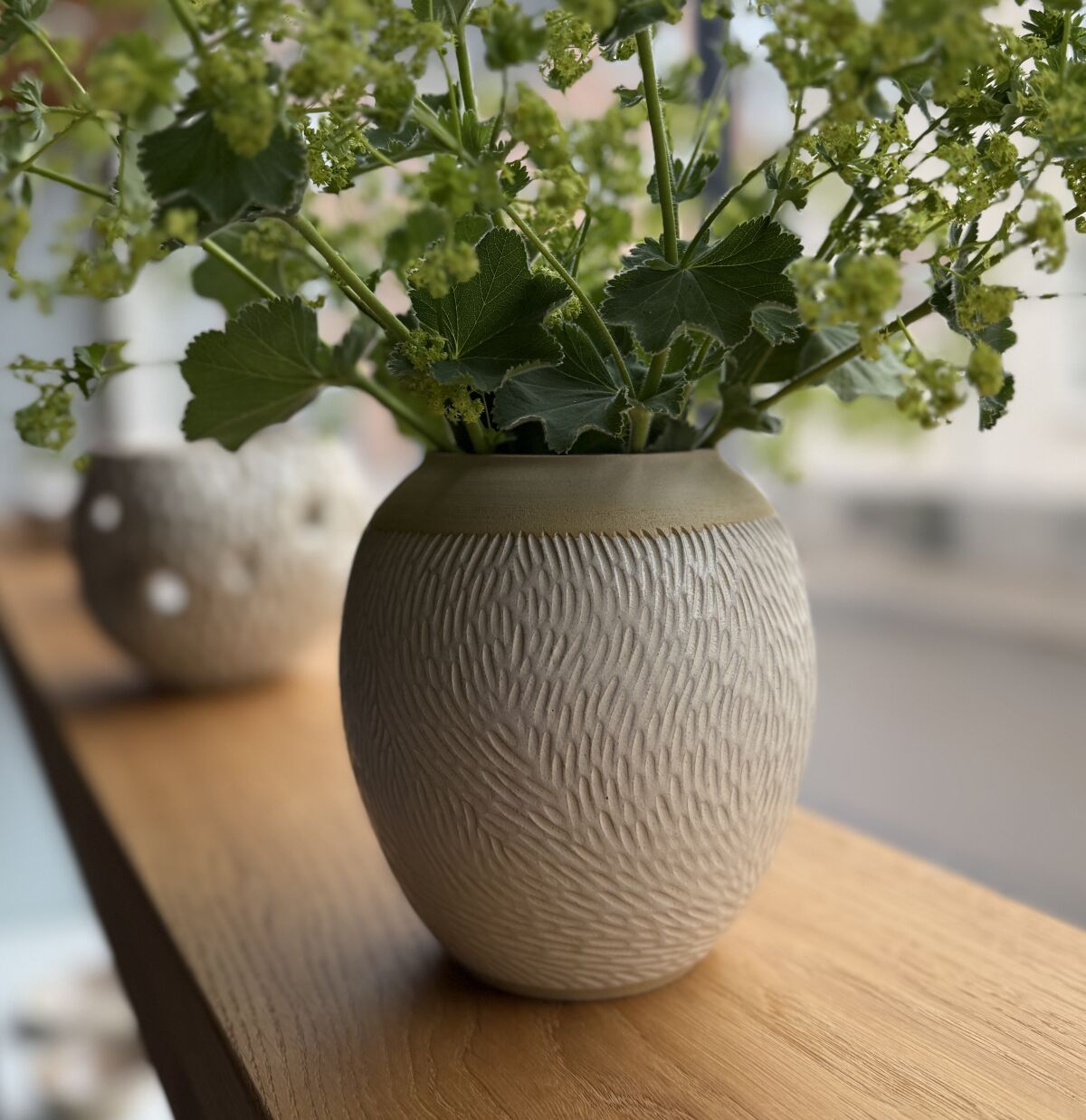 Jeg arbejder primært i stentøj, fordi materialet har en styrke og karakter, jeg holder af. Hver vase, skål eller kop er hånddrejet og derfor helt sin egen. Jeg henter ofte inspiration i det grafiske udtryk og bruger teknikker som carving og sgraffito, hvor linjer og mønstre skæres ind i overfladen. Det er et meditativt arbejde, hvor min grafiske baggrund møder det organiske materiale.