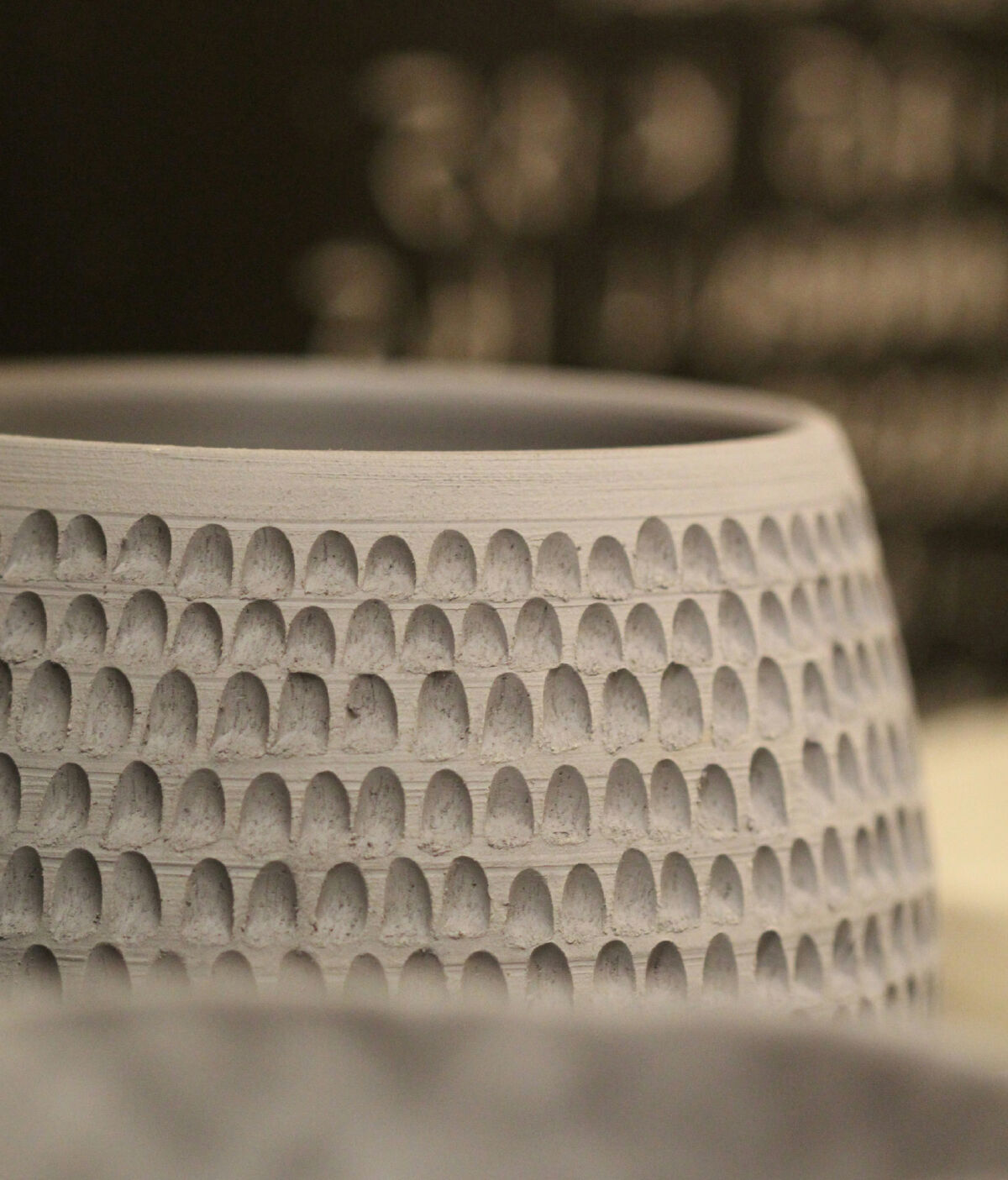 Særligt gennem teknikker som sgrafitto og carving kan jeg trække mine grafiske erfaringer med over i leret. Her arbejder jeg med overflader, mønstre og kontraster på en måde, der minder om det digitale design, men samtidig er håndgribeligt, levende og fuldstændig unikt. Hvor jeg foran computeren zoomer ind på pixels, mærker jeg nu materialet direkte under fingrene.